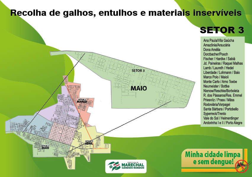 Agora, os moradores do setor 3 estão sendo orientados a depositar galhos e entulhos em frente às residências até o final do mês de maio. Este setor compreende: Ana Paula, Vila Gaúcha, Amazônia, Araucária, Dona Amélia, Dorzbacher, Pooch, Fischer, Hardke, Sabiá, Jardim Paineiras, Raquel Malhas, Lamb, Laureth, Hedel, Liberdade, Lohmann, Baio, Marco Polo, Maioli, Monte Carlo, Arno Toebe, Neumeister, Bootke, Nienow, Reschke, Borboleta, dos Pássaros, Residencial Emmel, Priesnitz, Prass, Mass, Rodoviária, Vorpagel, Santa Bárbara, Portobello, Syperreck, Trento, Vale do Sol, Heimerdinger, Andorinha I e II e Porto Alegre.