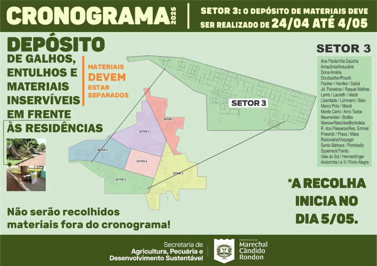 Agora, é a vez dos moradores do setor três, que devem depositar os materiais em frente às residências até o dia quatro de maio. A recolha será realizada a partir do dia cinco.
