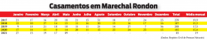 No município rondonense, no primeiro semestre de 2020 foram registrados 76 casamentos, enquanto no segundo semestre aconteceram 109 uniões no cartório. Se comparado aos anos anteriores, contudo, os casamentos em 2020 estiveram abaixo da média anual, visto que em 2019 foram registrados 208 casamentos, em 2018 foram registrados 187 e em 2017 foram registrados 239. Até meados de maio deste ano, Marechal Rondon contava com 85 uniões.