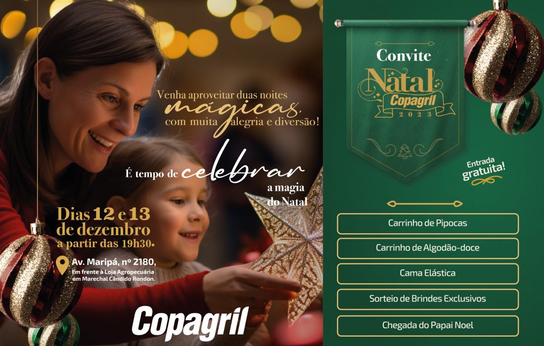 A Cooperativa Agroindustrial Copagril realiza nesta terça (12) e quarta-feira (13) a 1ª edição do evento “Natal Copagril”, que acontecerá a partir das 19h30, em frente à Loja Agropecuária Copagril, em Marechal Cândido Rondon.