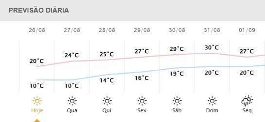 Em Toledo, expectativa de sol ao longo do dia, com rajadas de vento de até 20km/h, mínima de 10°C e máxima de 19°C.