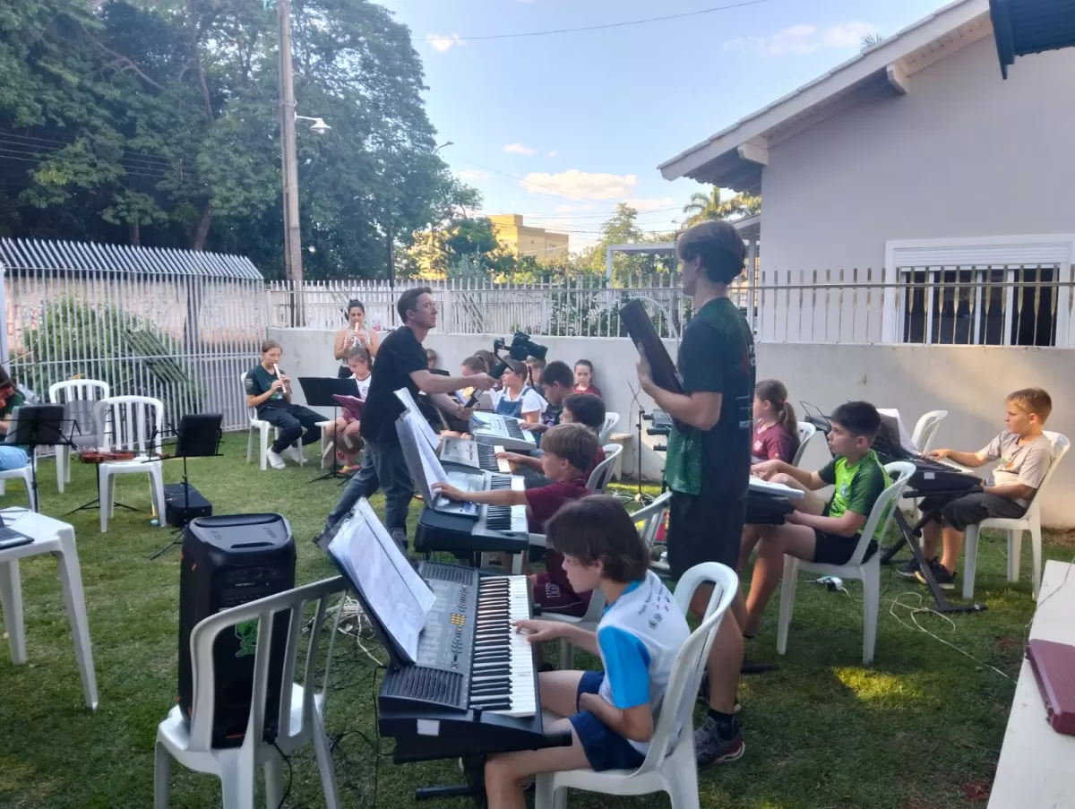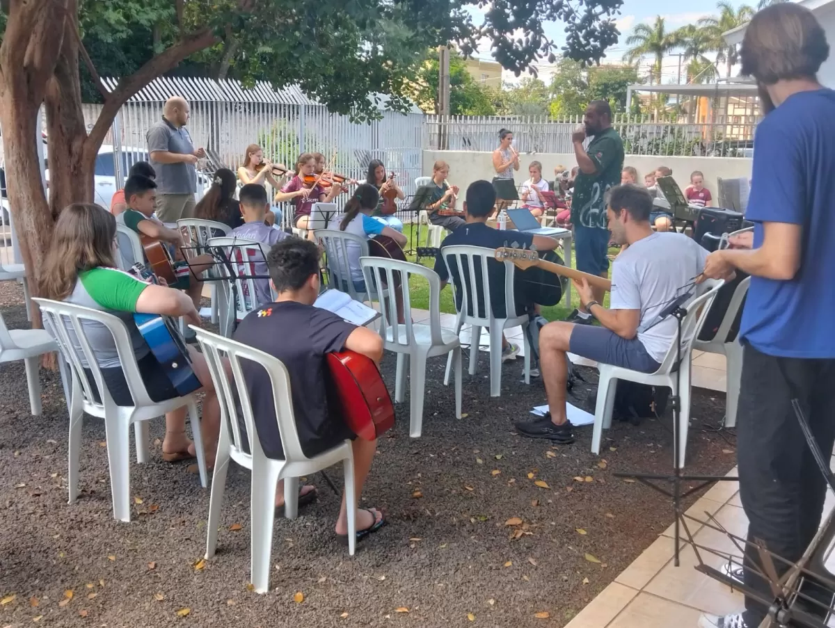 As oficinas oferecidas (de música instrumental), com duração de oito meses, iniciaram em 31 de março de 2025, com a participação de 92 alunos, de 21 instituições de ensino do Município e região, sendo cinco estaduais, 11 municipais, quatro particulares e um universidade. Ainda temos a participação de alunos do CAF – Centro de Atendimento à Família, que estão todos matriculados em escolas municipais.