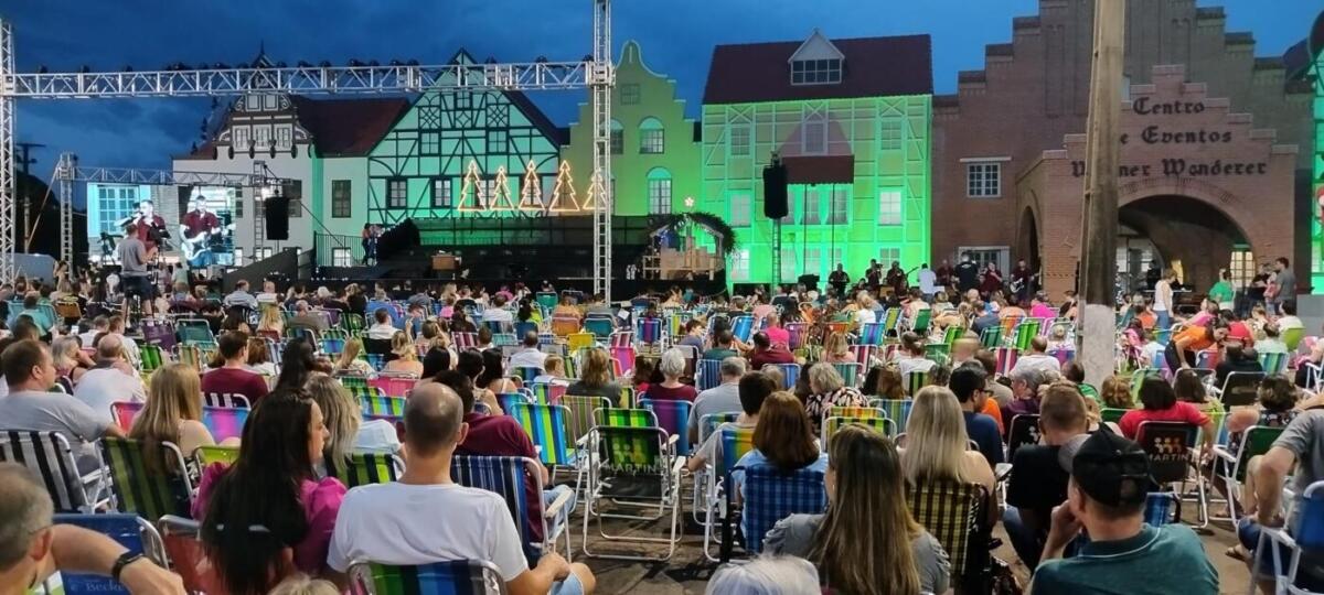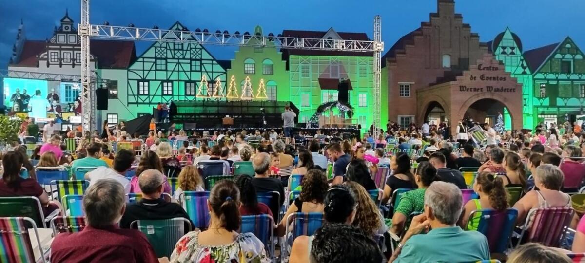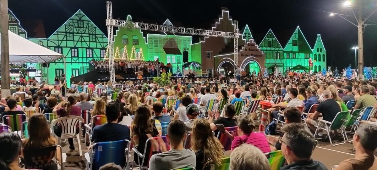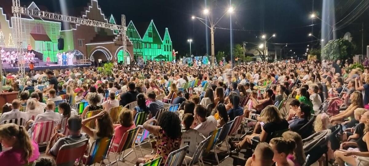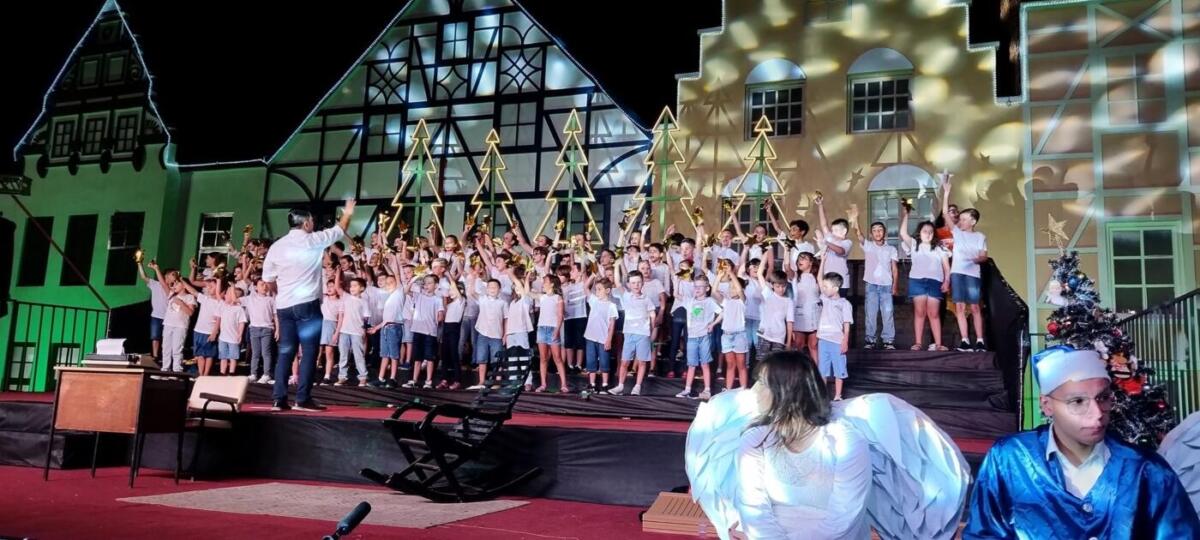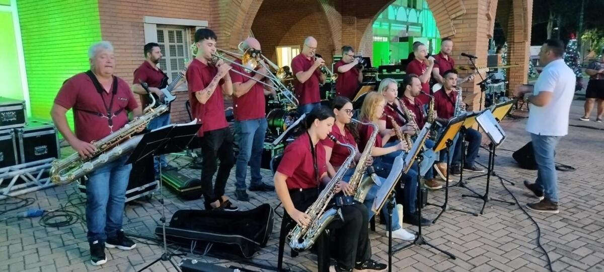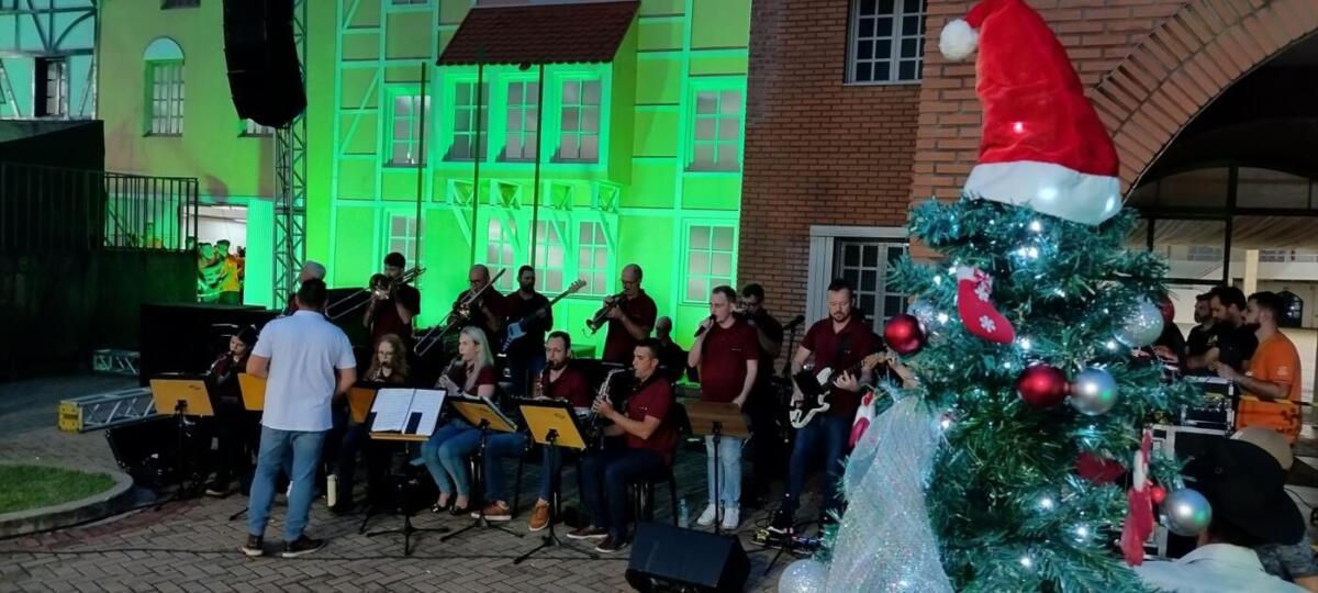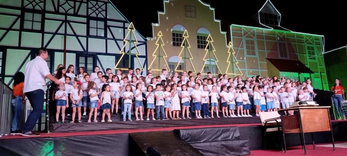 A programação natalina deste sábado (02), no Centro de Eventos de Marechal Cândido Rondon, contou com apresentação da Orquestra de Sopros e Natal de Luzes do Colégio Martin Luther, com o tema “Um Conto de Natal”.