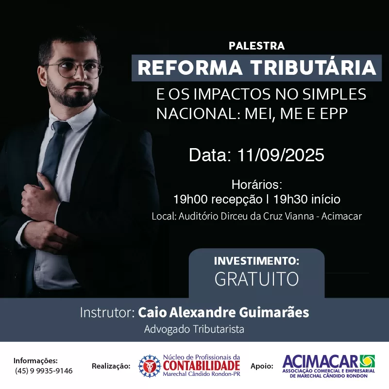 O Núcleo dos Profissionais da Contabilidade da Acimacar promove, nesta quinta-feira dia 11 de setembro de 2025, a palestra “A Reforma Tributária e os impactos no Simples Nacional: MEI, ME e EPP”, com o objetivo de esclarecer de forma prática e acessível as principais mudanças que a reforma trará para os pequenos negócios.