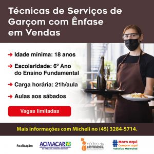 O Núcleo de Gastronomia da Associação Comercial e Empresarial de Marechal Cândido Rondon (Acimacar) realiza o curso “Técnicas de Serviços de Garçom com Ênfase em Vendas”.