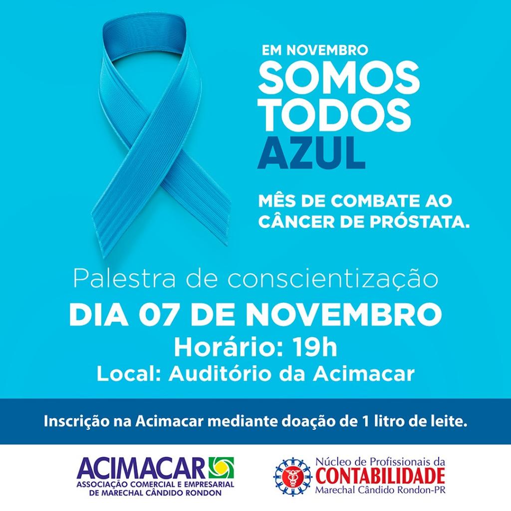 A fim de conscientizar a população masculina sobre a importância dos cuidados com a saúde, especialmente com relação a prevenção e tratamento do câncer de próstata, o Núcleo de Profissionais da Contabilidade da Associação Comercial e Empresarial de Marechal Cândido Rondon (Acimacar) promove, no dia 7 de novembro, uma palestra alusiva ao mês mundial do combate ao câncer de próstata, o Novembro Azul.