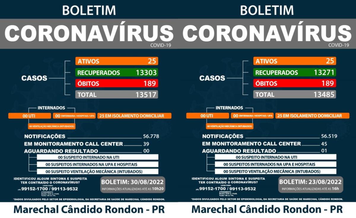 Compare os últimos dois boletins da Covid-19 emitidos em Marechal Rondon: