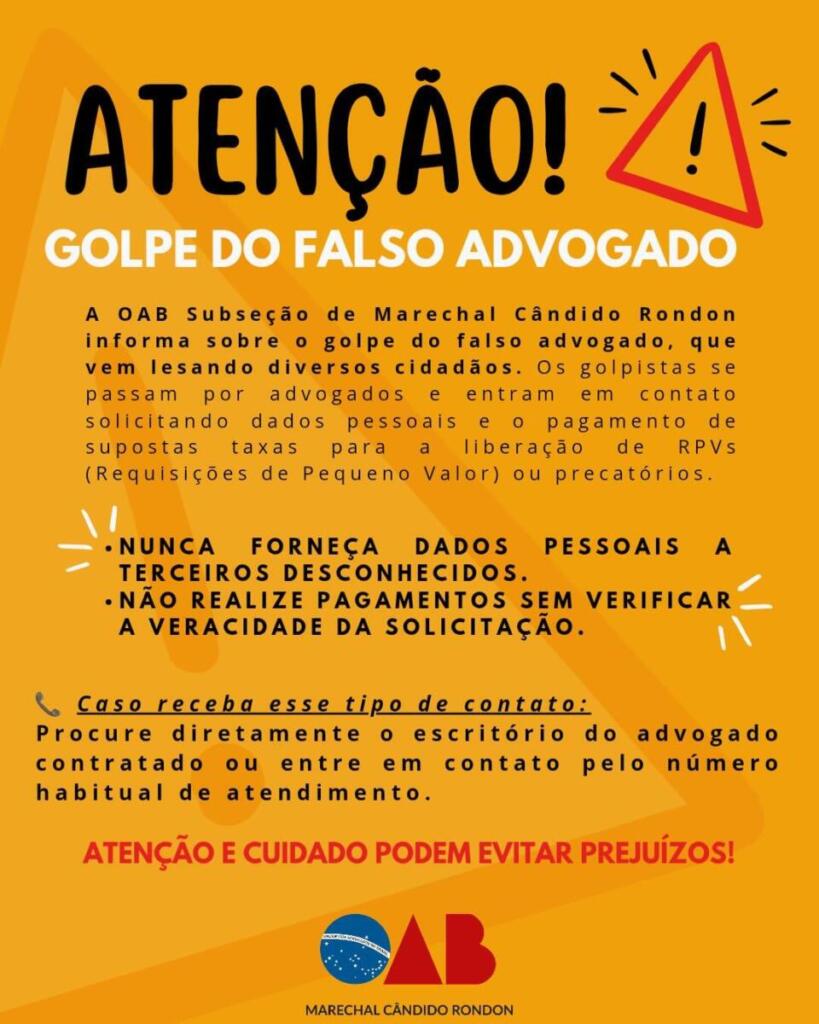 A OAB Subseção de Marechal Cândido Rondon está emitindo um alerta para a população sobre um golpe que tem lesado diversos cidadãos da região. Conhecido como o “golpe do falso advogado”, a prática criminosa consiste em pessoas que se passam por advogados para solicitar dados pessoais e pagamentos de taxas falsas, sob o pretexto de liberar valores referentes a Requisições de Pequeno Valor (RPVs) ou precatórios.