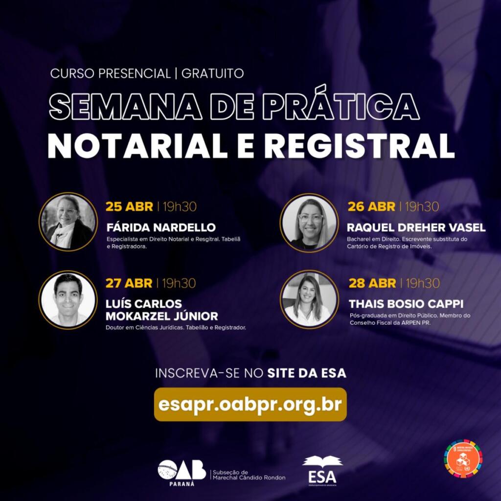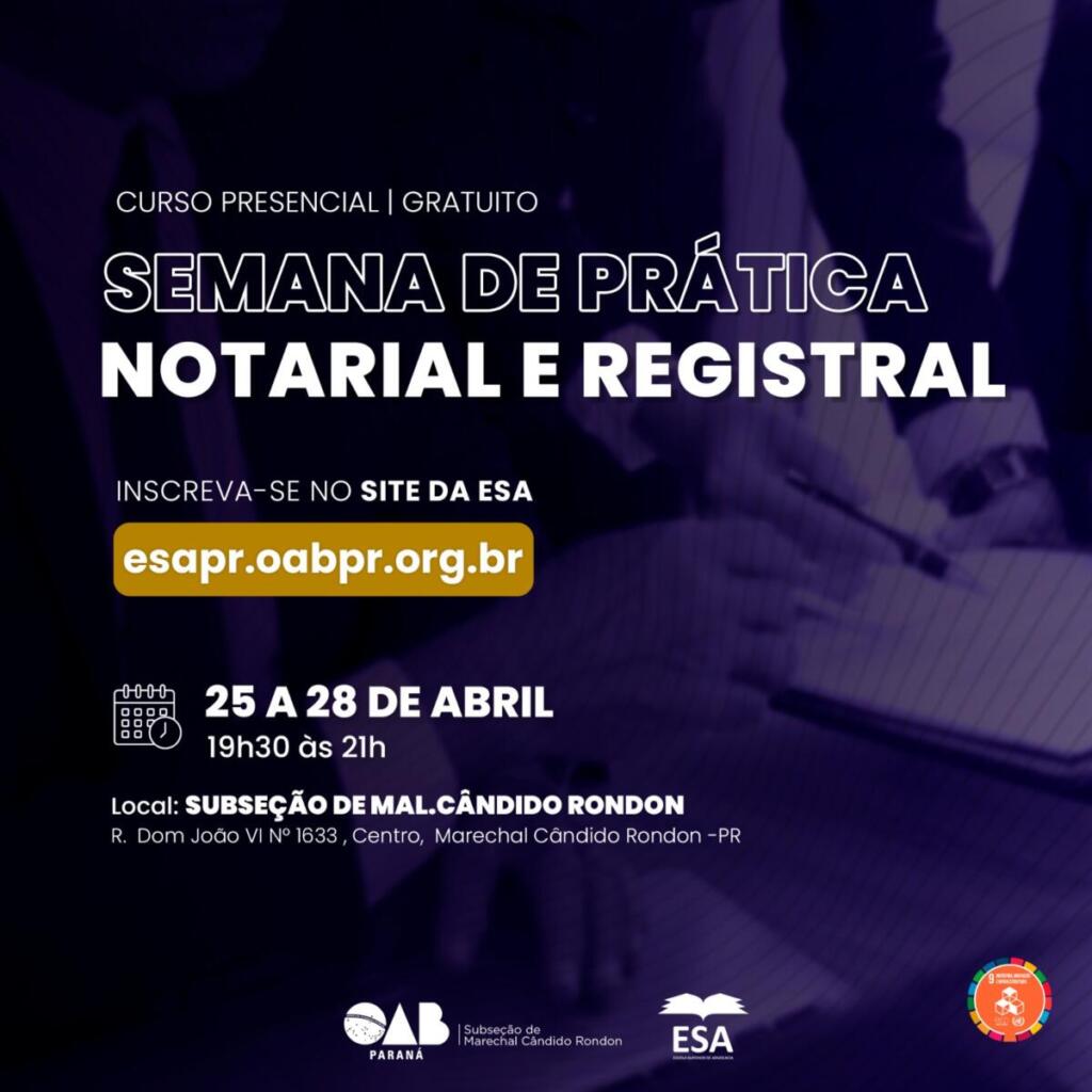 Estão abertas as inscrições gratuitas aos cursos da Semana de Prática Notarial e Registral, promovida pela Ordem dos Advogados do Brasil (OAB) – Subseção de Marechal Cândido Rondon, em parceria com a Escola Superior de Advocacia (ESA).
