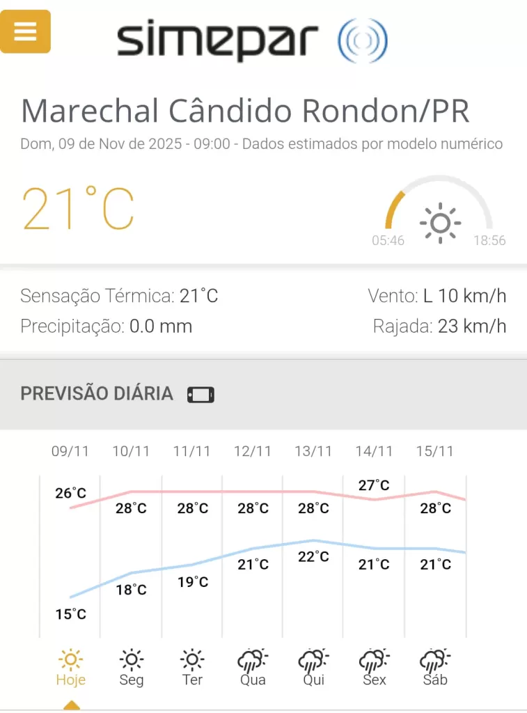 Veja a previsão do tempo para os próximos dias em Marechal Rondon, segundo o Simepar:
