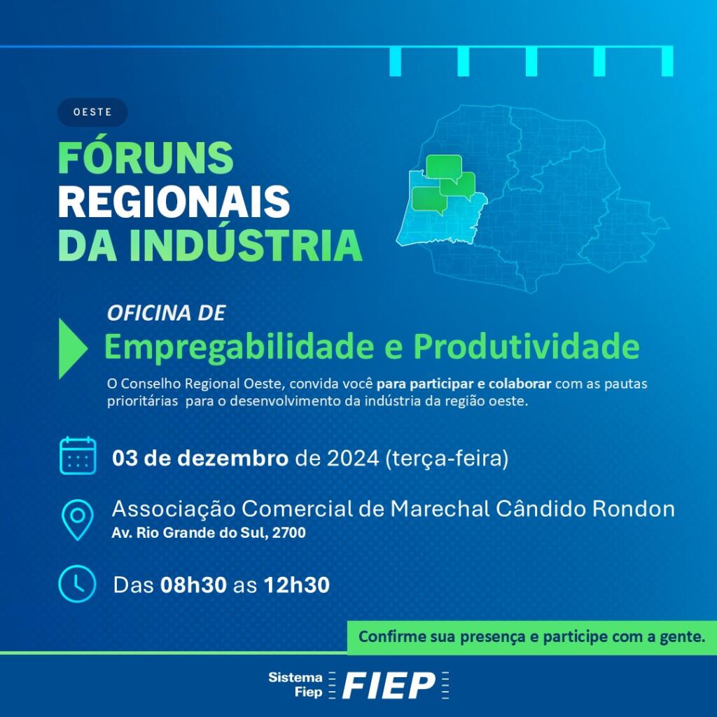 A indústria paranaense está prestes a viver um momento de transformação e inovação, e você pode fazer parte dessa mudança! Nesta terça-feira (3), será realizada uma Oficina Temática de Empregabilidade e Produtividade, evento promovido pelo Conselho Regional Oeste e o Sistema Fiep, com o objetivo de debater soluções, compartilhar experiências e propor ideias inovadoras para fortalecer a indústria da região e gerar mais empregos. A programação acontecerá das 08h30 às 12h30, na Associação Comercial de Marechal Cândido Rondon (Acimacar).