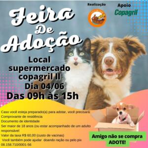 Neste sábado (04), a ONG Arca de Noé, de Marechal Cândido Rondon, realiza uma Feira de Adoção de Animais no pátio do Supermercado Copagril II, das 09 às 15 horas.