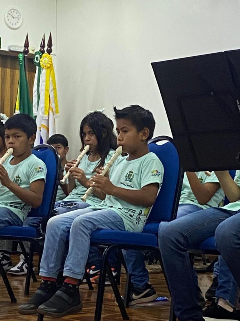 Setenta por cento das crianças da Orquestra Vila Guarani são indígenas, representantes das aldeias Araguaju, Yvyraty Porã, Yvy Porã, e o restante crianças da própria vila.