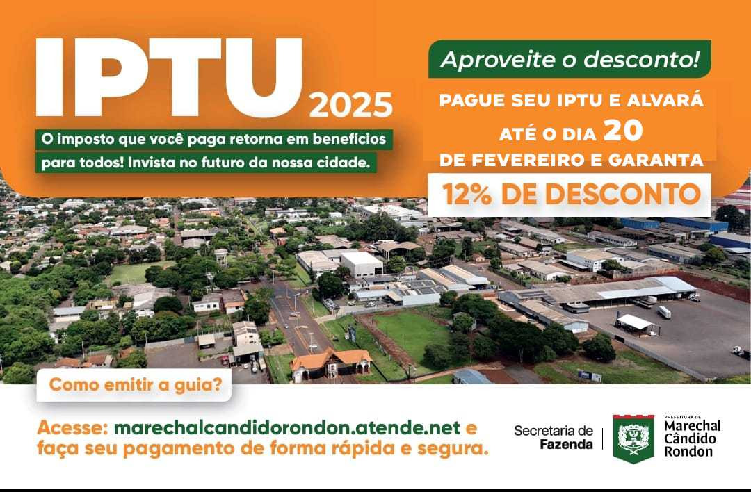 A Secretaria de Fazenda da prefeitura de Marechal Cândido Rondon, lembra que o prazo para pagamento do IPTU e do Alvará com 12% de desconto em parcela única termina nesta quinta-feira, 20 de fevereiro. Esse desconto é válido exclusivamente para guias emitidas pelo contribuinte por meio da internet, no site: marechalcandidorondon.atende.net.