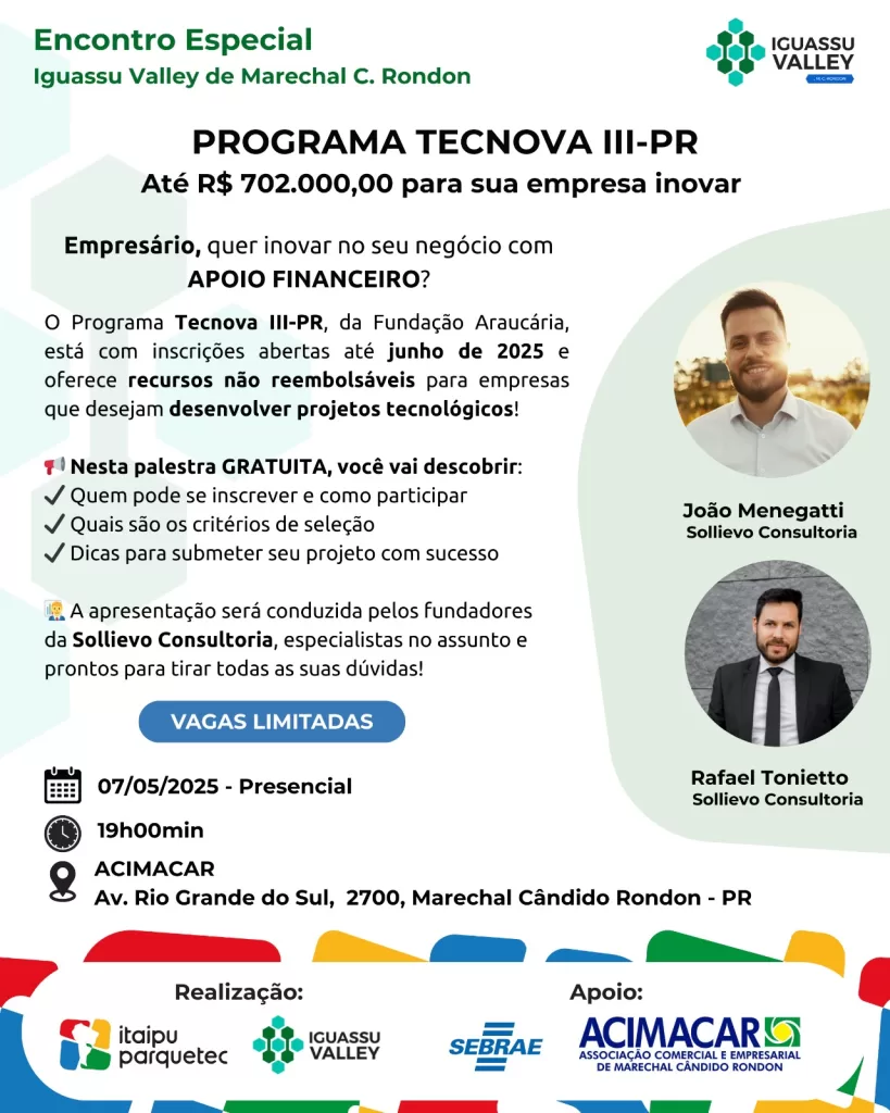 Para orientar empreendedores e gestores sobre como acessar os recursos do edital, o Itaipu Parquetec e o Iguassu Valley de Marechal Cândido Rondon, com apoio do Sebrae e da Acimacar, promovem uma palestra gratuita e presencial, conduzida pela Sollievo Consultoria.