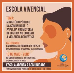 A violência doméstica envolve mitos. Por isso, informação e conhecimento são elementos fundamentais para evitar conflitos. Com este objetivo, a Escola Vivencial do Movimento de Cursilhos de Cristandade (MCC) – Setor Rondon promove nesta terça-feira (10) a palestra com o tema “Ministério Público na comunidade: o papel da Promotoria de Justiça no combate à violência doméstica”, ministrada pelo promotor Caio Di Rienzo.