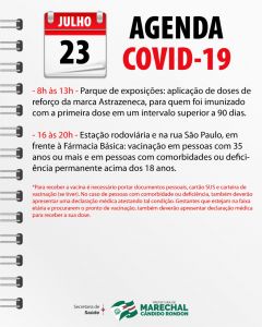A 20ª Regional de Saúde encaminhou mais doses de vacinas contra a Covid-19 para Marechal Rondon, por isso a Secretaria de Saúde rondonense dará sequência ao cronograma de imunização. Nesta sexta-feira, dia 23, serão imunizadas pessoas com 35 anos ou mais e em pessoas com comorbidades ou deficiência permanente acima de 18 anos. O atendimento será das 16 horas às 20 horas, na estação rodoviária e na rua São Paulo, em frente à Farmácia Básica. Neste horário não haverá vacinação no parque de exposições, tendo em vista a programação de aniversário do município, quando estará acontecendo a retirada de prato típico alemão, no sistema “drive thru”, no pavilhão alemão.