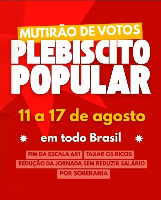Desde o mês de julho, o Brasil tem em curso um Plebiscito Popular onde todos os brasileiros podem votar sobre o fim da escala 6X1, a Taxação dos super ricos e a isenção do Imposto de Renda para quem ganha até 5 mil Reais.