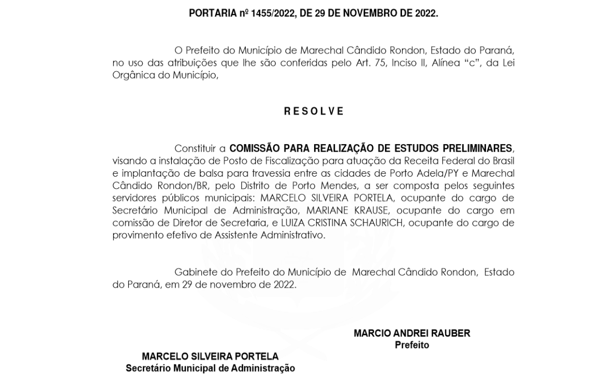 Inicialmente, e conforme a portaria publicada pela municipalidade, a comissão será formada pelo secretário municipal de Administração, Marcelo Portela; diretora da Secretaria, Mariane Krause; e a assistente administrativo Luiza Cristina Schaurich.