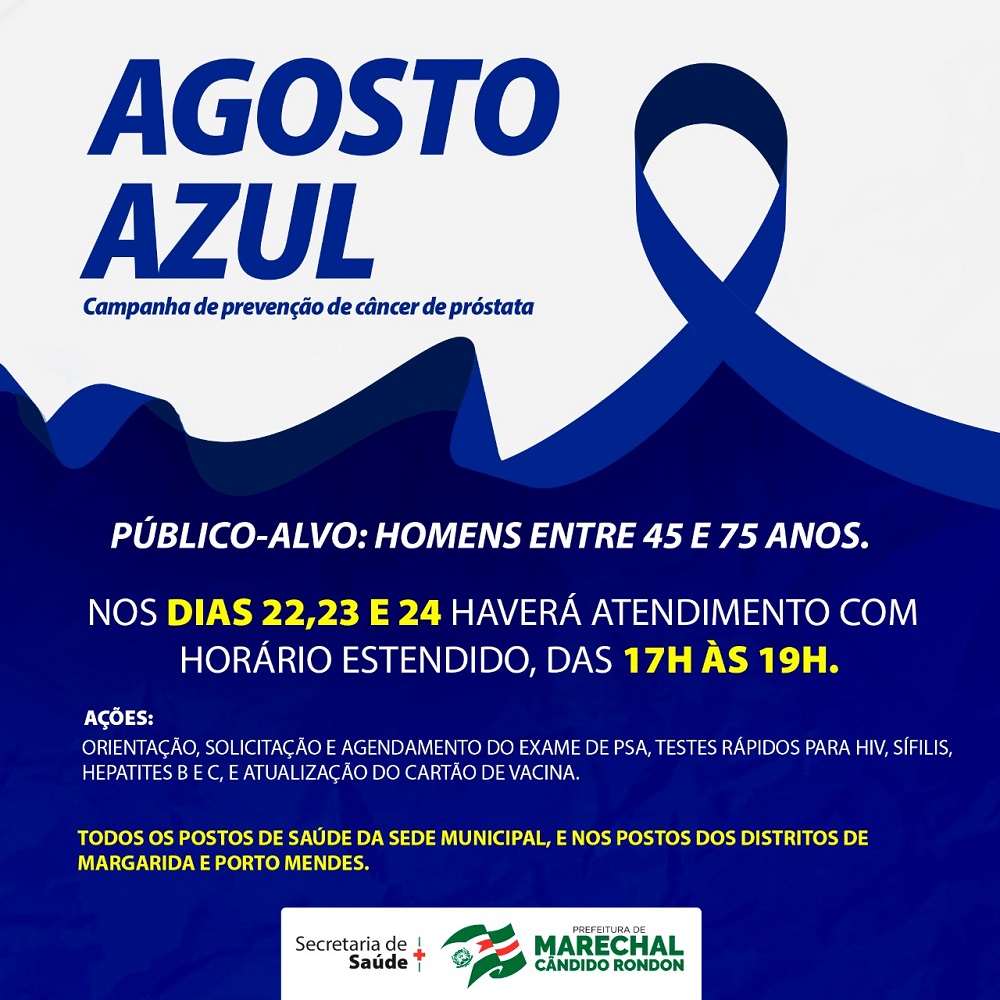 A campanha focada na prevenção ao câncer de próstata tem como público-alvo homens com idade entre 45 e 75 anos. Em Marechal Rondon, a Secretaria de Saúde disponibiliza horário diferenciado em todos os postos de saúde da sede municipal e nos postos dos distritos de Margarida e Porto Mendes, com atendimento das 17 horas às 19 horas desde segunda-feira (22), incluindo esta terça-feira (23) e quarta-feira (24).