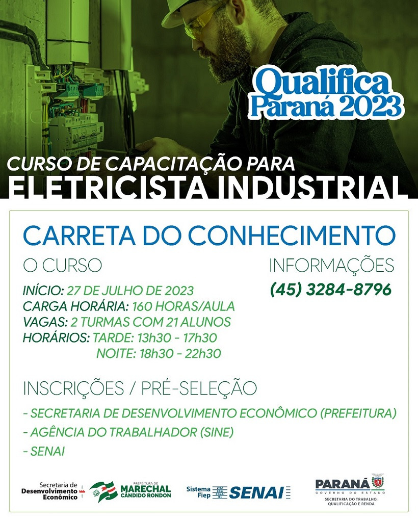 Marechal Cândido Rondon é um dos 13 municípios paranaenses contemplados com cursos através do Qualifica Paraná. O município irá promover a capacitação de eletricista industrial, cujas pré-inscrições estão abertas e podem ser feitas até sexta-feira (14), na Agência do Trabalhador (Sine), no Serviço Nacional de Aprendizagem Industrial (Senai) e na Secretaria de Desenvolvimento Econômico, na prefeitura. Os candidatos inscritos passarão por uma seleção feita pelo Senai e os aprovados poderão participar do curso.