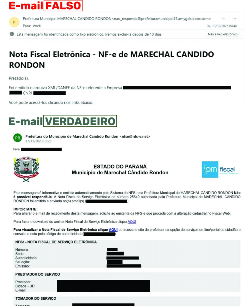 Confira sempre o endereço de e-mail e verifique se o remetente utiliza um domínio oficial da prefeitura, como @mcr.pr.gov.br ou nfse@nfs-e.net. Tenha cuidado com endereços que apresentem erros de digitação, sequências estranhas de caracteres ou variações incomuns. E-mails fraudulentos geralmente contêm erros de português, formatação irregular ou logotipos distorcidos.