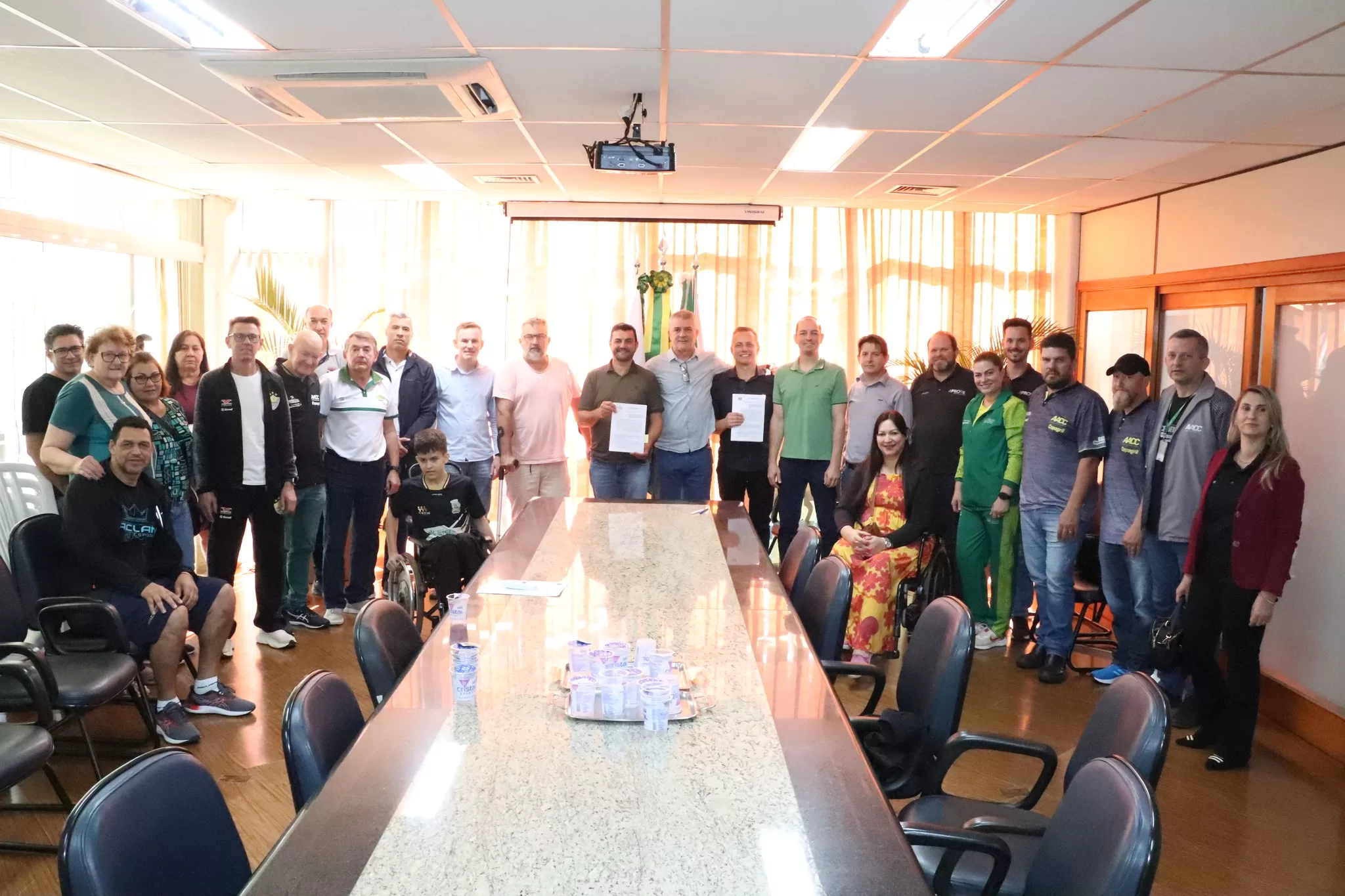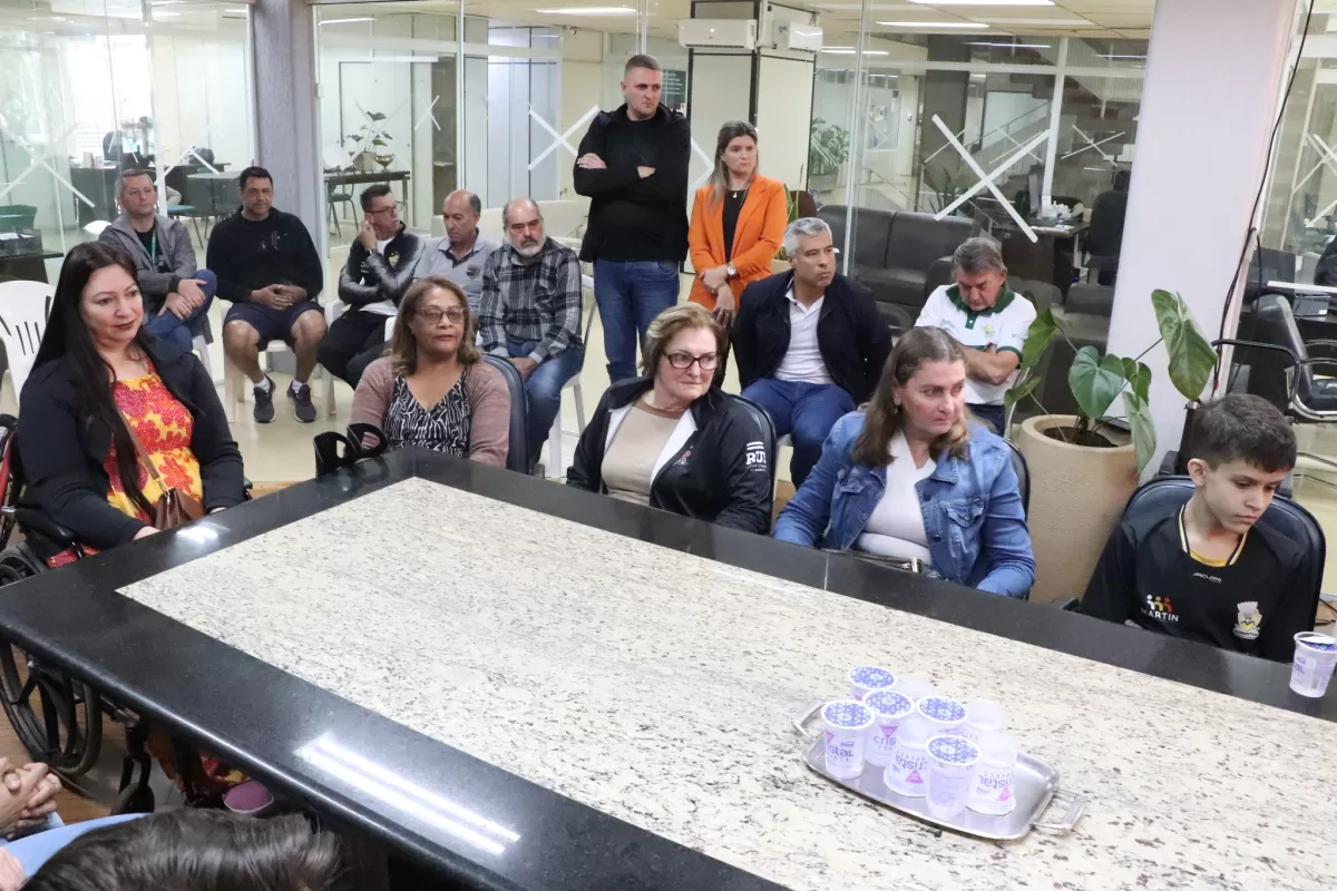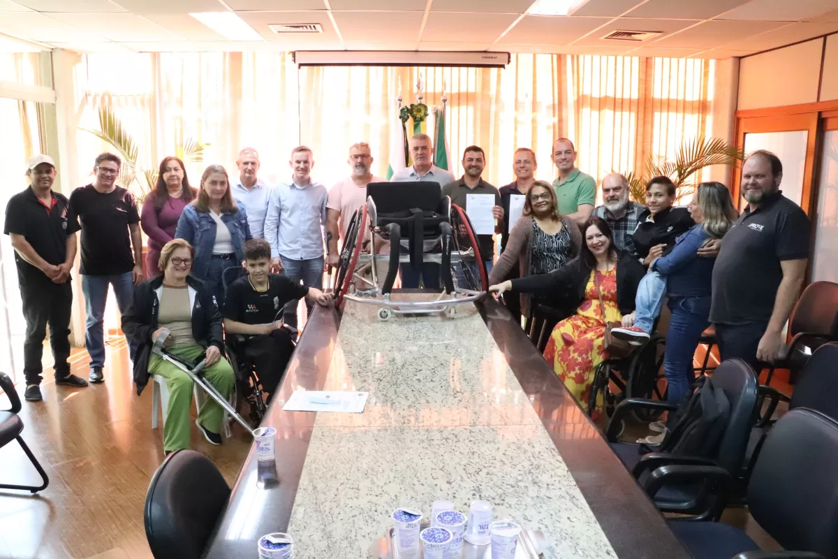 Durante o encontro, o prefeito Adriano Backes e o vice-prefeito Vanderlei Sauer também formalizaram a cessão de uso de 10 cadeiras de rodas esportivas novas, por meio de uma emenda parlamentar do deputado estadual, Alexandre Amaro, e quatro cadeiras seminovas cedidas pelo município à Assindamar. Os equipamentos foram produzidos sob medida e são destinados à prática de basquetebol, handebol, rugby e parabadminton, fortalecendo a inclusão de atletas com deficiência nas atividades esportivas do município.