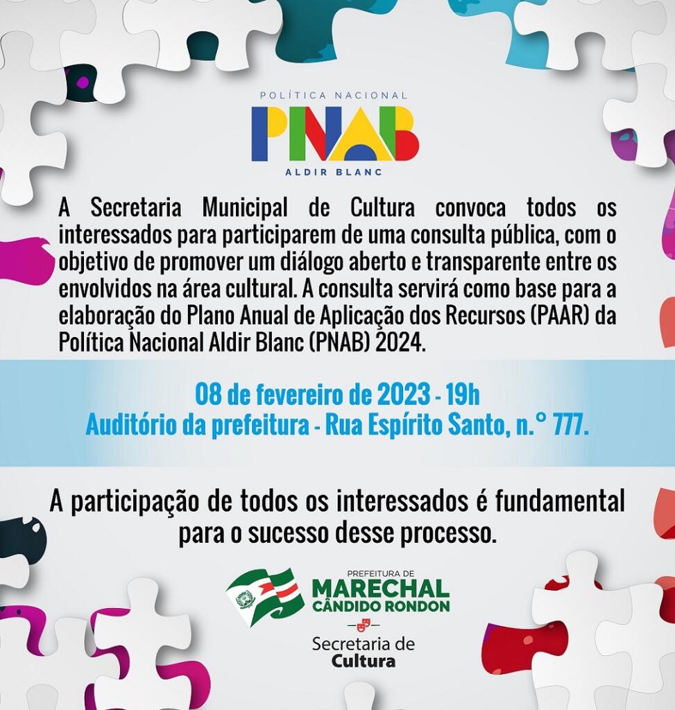 A Secretaria de Cultura de Marechal Cândido Rondon está convocando os rondonenses ligados à cultura para uma consulta pública que objetiva promover um diálogo aberto e transparente, que servirá como base para a elaboração do Plano Anual de Aplicação dos Recursos (PAAR) da Política Nacional Aldir Blanc (PNAB) 2024. O evento acontecerá na quinta-feira (8), às 19 horas, no auditório do paço municipal.