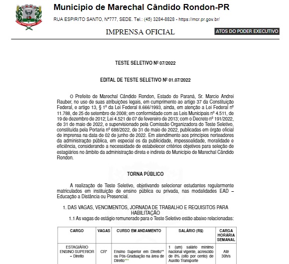 Ainda no edital consta que o teste seletivo está destinado ao preenchimento de vagas e formação de cadastro reserva de estudantes para estágio na administração municipal.