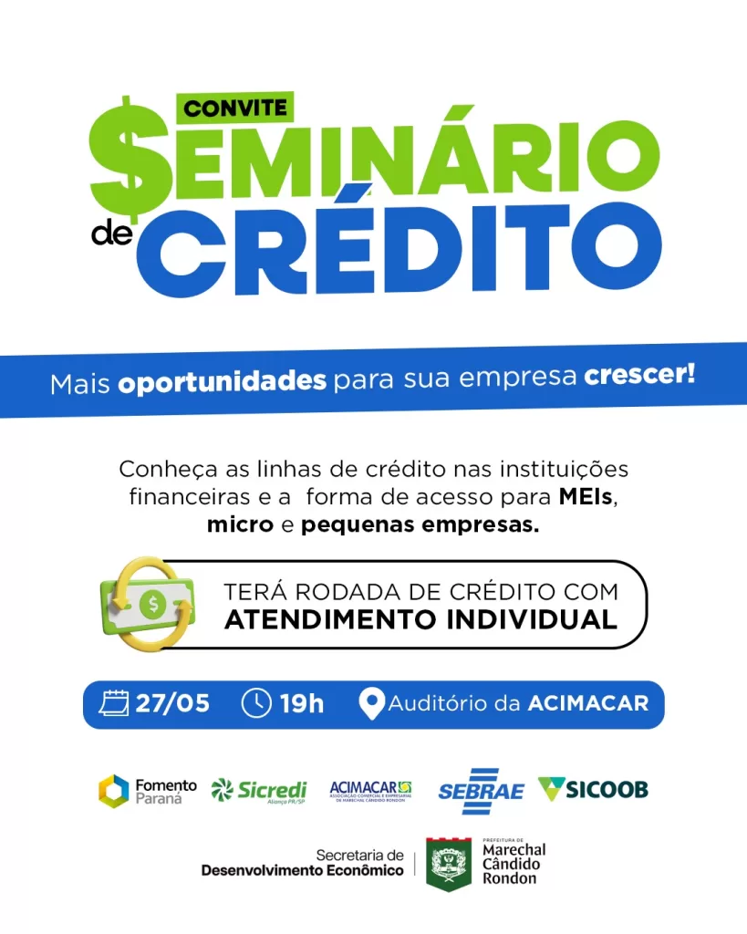 A prefeitura de Marechal Rondon, por meio da Secretaria de Desenvolvimento Econômico e do Módulo Empresarial, promoverá mais uma edição do Seminário de Crédito. O evento, oferecido gratuitamente para microempreendedores individuais (MEIs) e micro e pequenas empresas, contará com o apoio da Associação Comercial e Empresarial de Marechal Cândido Rondon (Acimacar) e do SEBRAE.