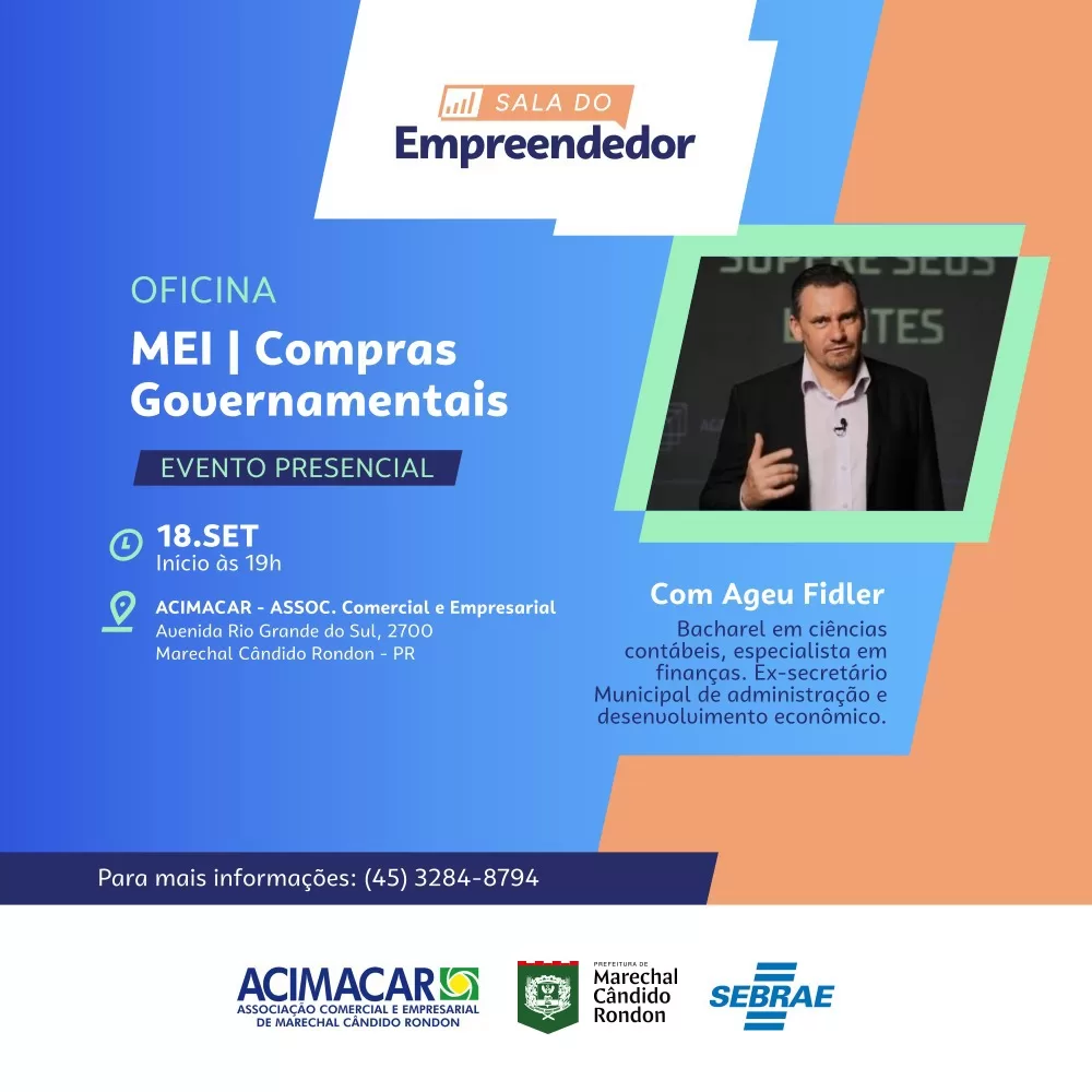 A prefeitura de Marechal Cândido Rondon, por meio da Secretaria de Desenvolvimento Econômico e da Sala do Empreendedor, em parceria com o Sebrae e a Acimacar, promove no próximo dia 18 de setembro a palestra “Compras Governamentais”.