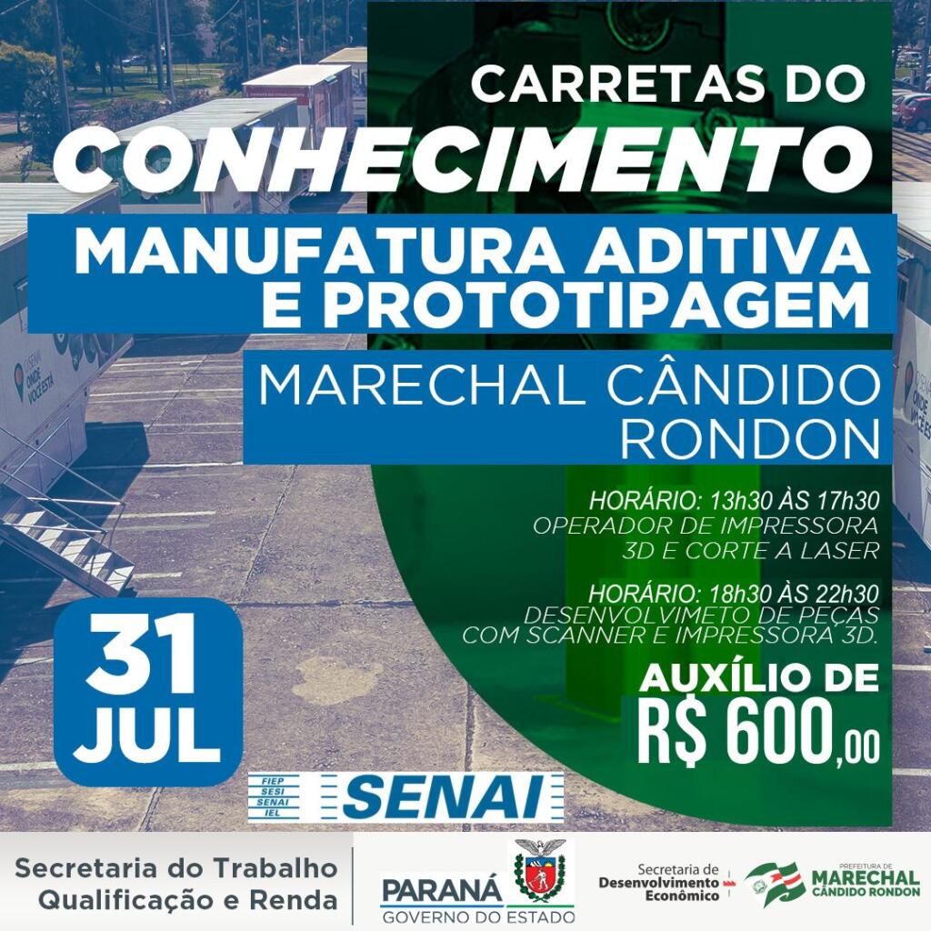 A Secretaria de Estado do Trabalho, Qualificação e Renda, através do programa Mais Qualificação, em parceria com a prefeitura de Marechal Cândido Rondon, através da Secretaria de Desenvolvimento Econômico e do Sine, com o apoio do Senai, abriu as inscrições para mais duas capacitações, que estão sendo oferecidas gratuitamente para a comunidade. Além disso, cada aluno receberá uma bolsa-auxílio de R$ 600.