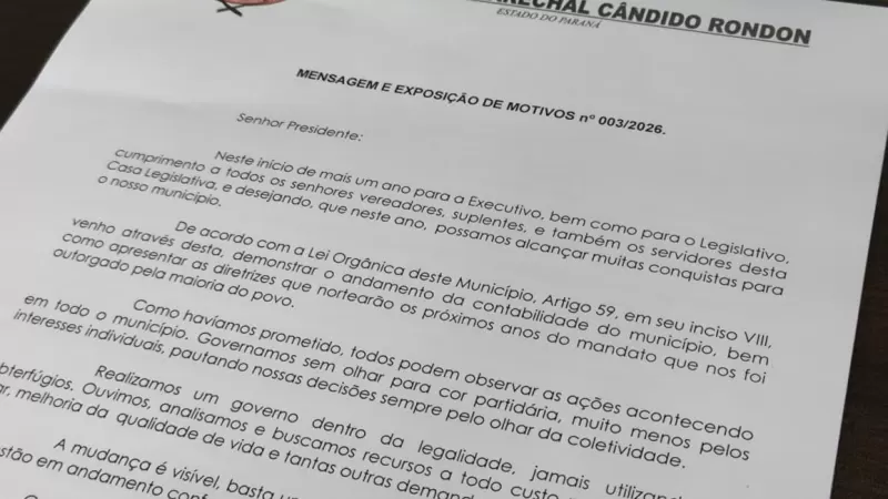 A prefeitura de Marechal Cândido Rondon encerrou o exercício financeiro de 2025 com um superávit financeiro de recursos livres de R$ 68,4 milhões, conforme dados apresentados na Mensagem e Exposição de Motivos nº 003/2026, encaminhada à Câmara de Vereadores pelo prefeito Adriano Backes e pelo vice-prefeito Vanderlei Sauer. O documento deve ser lido na sessão ordinária desta segunda-feira, dia dois de fevereiro.