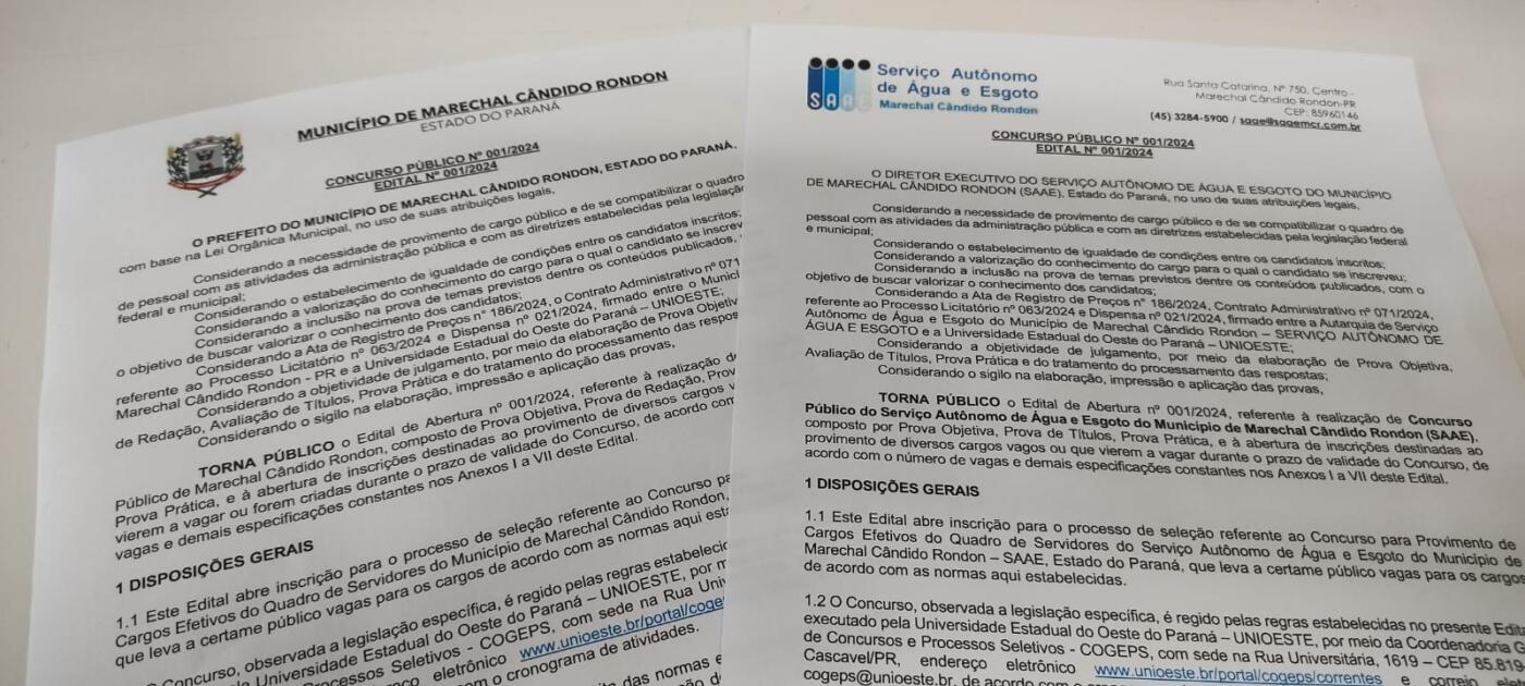 Dois editais foram publicados no Diário Oficial Eletrônico da prefeitura de Marechal Cândido Rondon nesta terça-feira (30), referentes à realização de concursos públicos para a prefeitura e para o Serviço Autônomo de Água e Esgoto (Saae).
