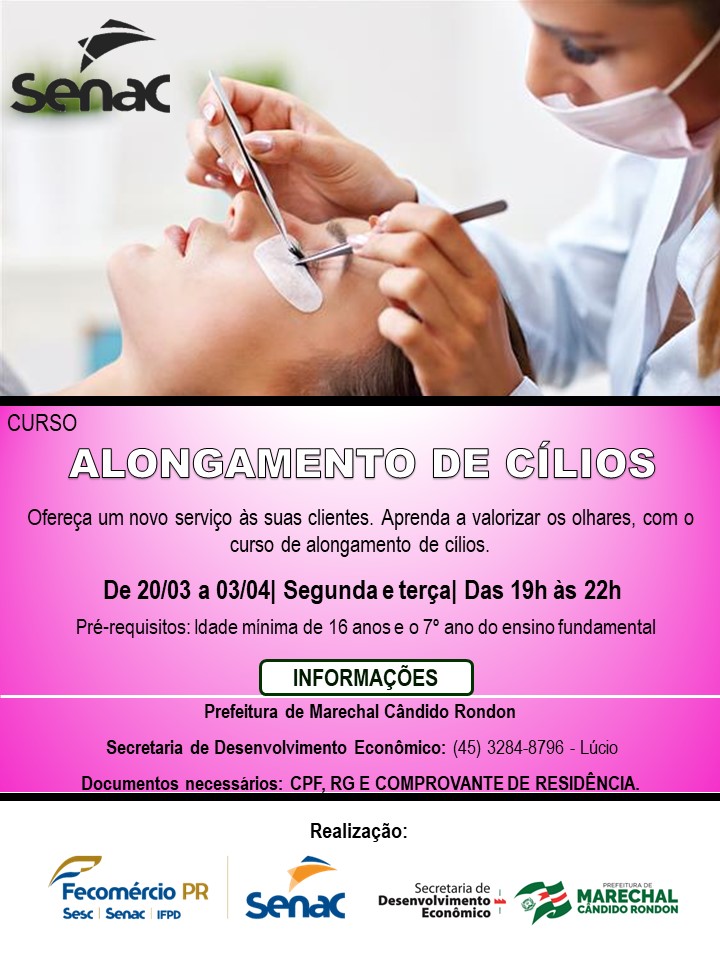 Outro treinamento, cujas inscrições estão abertas, é o de Alongamento de Cílios. As aulas acontecerão de 20 de março a 03 de abril, nas segundas e terças-feiras, das 19 horas às 22 horas. Para participar é necessário ter idade mínima de 16 anos e o 7º ano do ensino fundamental.