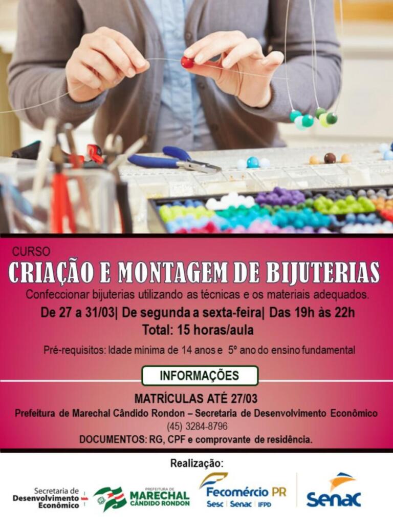 Também continuam abertas as inscrições para o curso de Criação e Montagem de Bijuterias. A capacitação será desenvolvida de 27 a 31 de março, de segunda a sexta-feira, das 19 horas às 22 horas, com um total de 15 horas/aula. Para participar, entre os pré-requisitos estão ter idade mínima de 14 anos e o 5º ano do ensino fundamental (pode estar cursando).