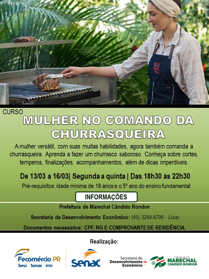 Um deles é o curso Mulher no Comando da Churrasqueira, que visa estimular o público feminino a fazer um churrasco saboroso, ensinando sobre cortes, temperos, finalizações, acompanhamentos e dicas imperdíveis. A capacitação acontece de 13 a 16 de março, das 18h30 às 22h30. Entre os pré-requisitos está ter idade mínima de 18 anos e o 5º ano do ensino fundamental.