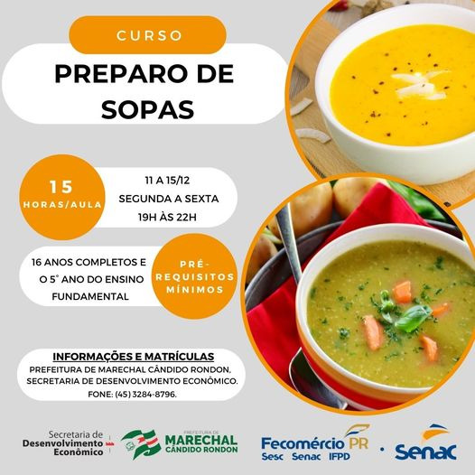 A prefeitura de Marechal Cândido Rondon, através da Secretaria de Desenvolvimento Econômico, com o apoio do SENAC, abriu as inscrições para o curso de preparo de sopas. A capacitação acontecerá de 11 a 15 de dezembro, das 19 às 22 horas, totalizando 15 horas/aulas.
