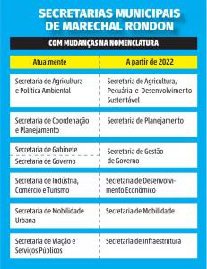 A atual estruturação das secretarias de Marechal Rondon sofrerá as seguintes alterações: a Secretaria de Coordenação e Planejamento passará a ser nominada como Secretaria de Planejamento; a Secretaria de Viação e Serviços Públicos passará a nominar-se como Secretaria de Infraestrutura; a Secretaria de Agricultura e Política Ambiental passará a ser Secretaria de Agricultura, Pecuária e Desenvolvimento Sustentável; a Secretaria de Indústria, Comércio e Turismo passará a ser Secretaria de Desenvolvimento Econômico; a Secretaria de Mobilidade Urbana passará a ser nominada como Secretaria de Mobilidade; e as secretarias de Gabinete e de Governo serão unificadas em uma única com o nome de Secretaria de Gestão de Governo. “As demais secretarias seguem no projeto com seus nomes inalterados”, indica.