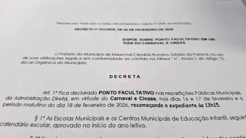 A prefeitura de Marechal Cândido Rondon emitiu decreto que estabelece ponto facultativo na administração direta em virtude do feriado de Carnaval.