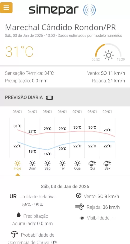 Veja a previsão do tempo para Marechal Cândido Rondon, conforme o Simepar: