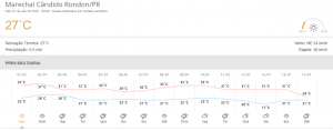 Em Marechal Cândido Rondon, por sua vez, as temperaturas variam entre 23°C e 35°C neste sábado (1º), com umidade relativa do ar entre 31% e 75%. Segundo o Simepar, o dia deve ser de céu claro e as rajadas de vento podem atingir 44 km/h.