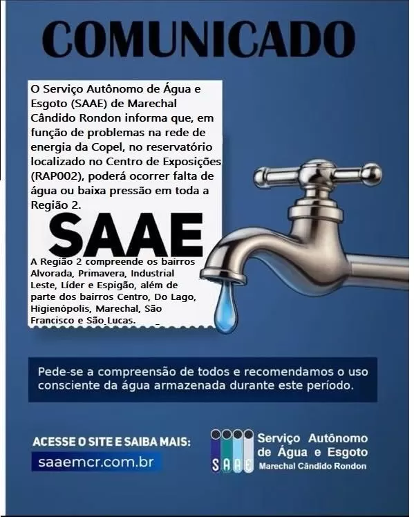 O Serviço Autônomo de Água e Esgoto (SAAE) de Marechal Cândido Rondon emitiu um comunicado alertando a população sobre possíveis interrupções no abastecimento de água ou baixa pressão em diversos bairros da cidade, devido a problemas na rede elétrica da Copel.