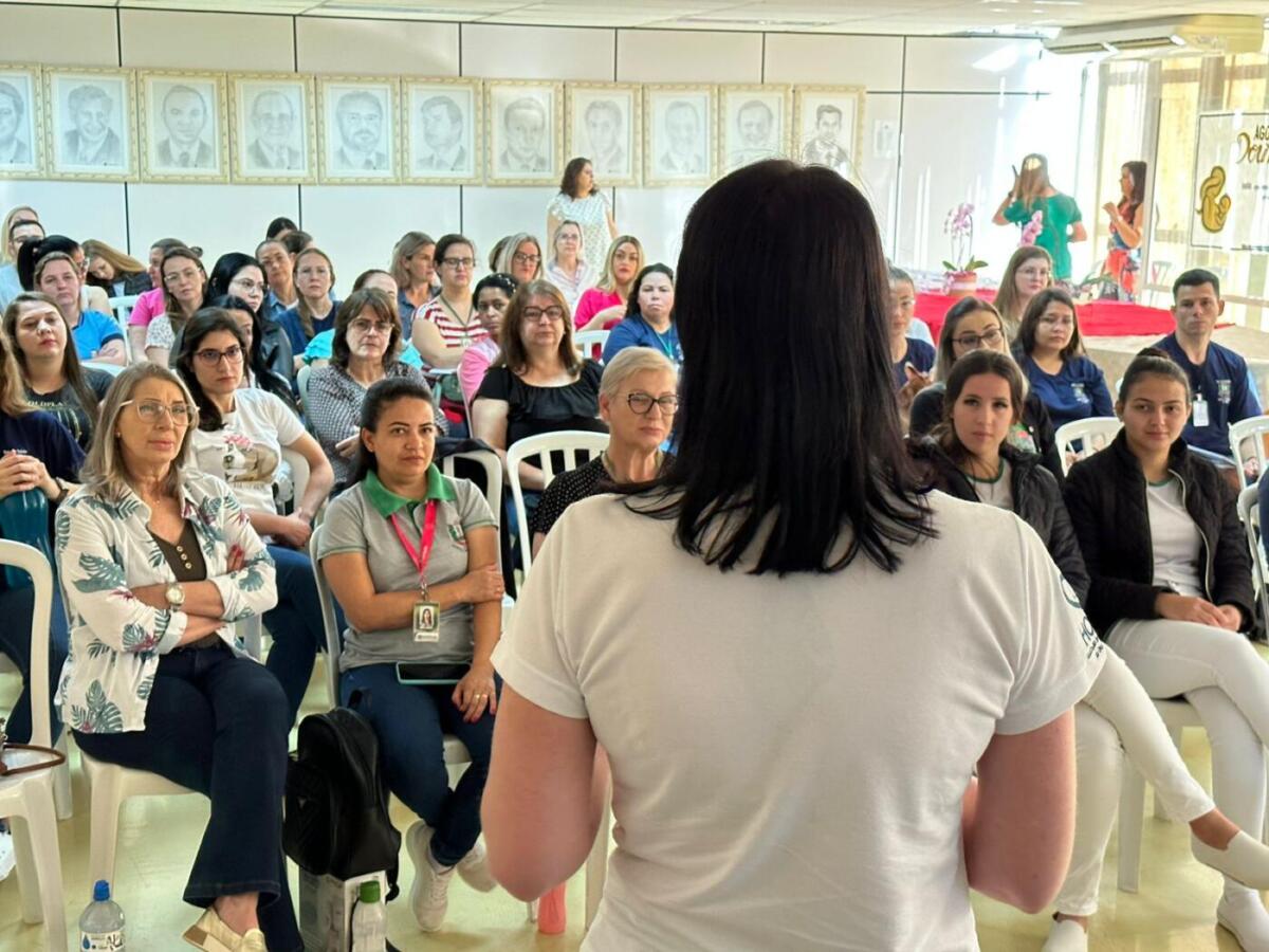 A enfermeira Tatiana Maria Pauli, responsável pelo banco de leite do Hospital Bom Jesus, de Toledo, ministra palestra voltada à importância do aleitamento materno.