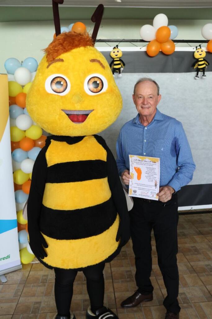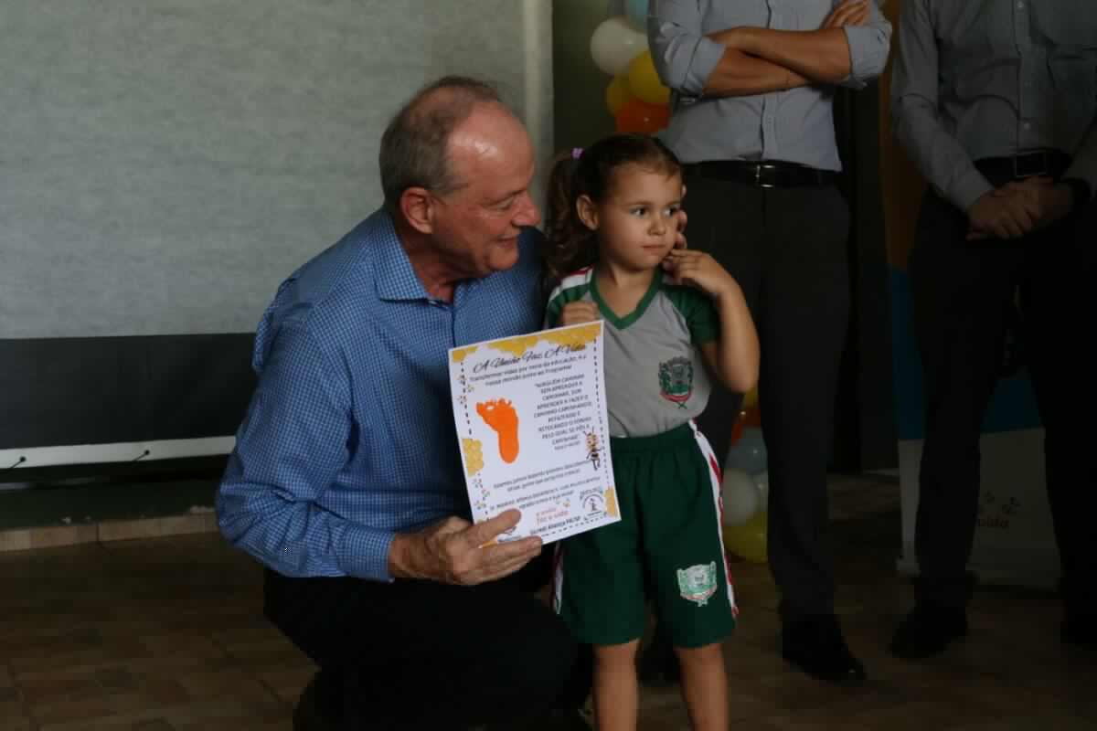 Sr. Manfred Dasenbrock, presidente da Central Sicredi PR/SP/RJ, esteve no CMEI e pode conhecer de perto os projetos realizados pelo CMEI em 2023 utilizando a metodologia do “A União Faz a Vida”, programa de educação que promove atitudes e valores de cooperação e cidadania e está completando 15 anos de atuação nos municípios atendidos pela cooperativa Sicredi Aliança PR/SP.