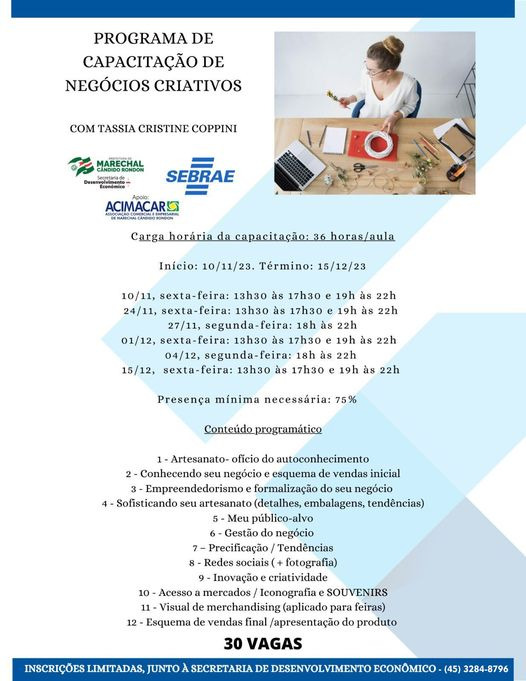 Encontram-se abertas até o dia 9 de novembro, as inscrições ao Programa de Capacitação de Negócios Criativos, curso oferecido gratuitamente pela prefeitura de Marechal Cândido Rondon, através da Secretaria Municipal de Desenvolvimento Econômico, em parceria com o Sebrae e a Associação Comercial e Empresarial (Acimacar).