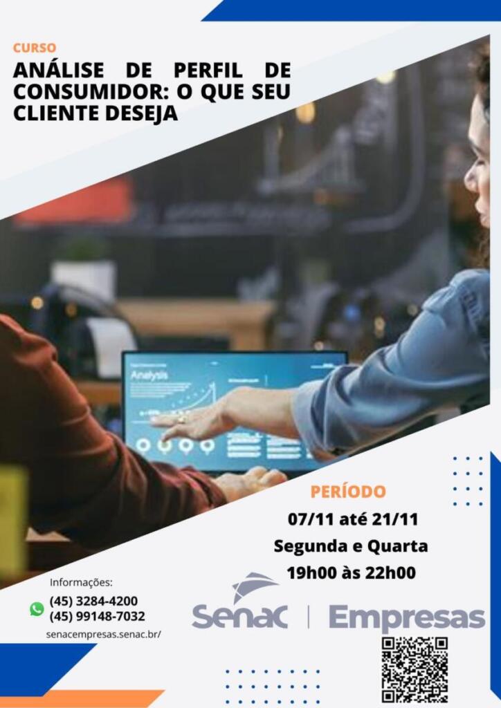 Será realizado nas segundas e quartas-feiras, das 19 horas às 22 horas, no Senac de Marechal Cândido Rondon, do dia 07 a 21 de novembro, com carga horária de 15 horas.