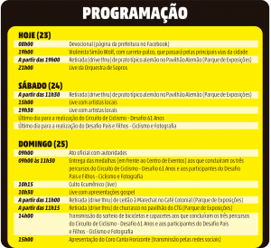 No domingo a programação inicia às 09 horas com ato oficial com autoridades, culto ecumênico e apresentações de música gospel a partir das 10h30, com performances de Fabrício Alves, Wilian e Danieli, Gabriele Gruber, Francielle Wild, Muriel Encinas, Mariana Wild, Gedean Silva, Karol e Layanna Fernanda. À tarde acontecem os sorteios referentes aos desafios de ciclismo e, posteriormente, o Coro Canta Horizonte se apresentará na transmissão.