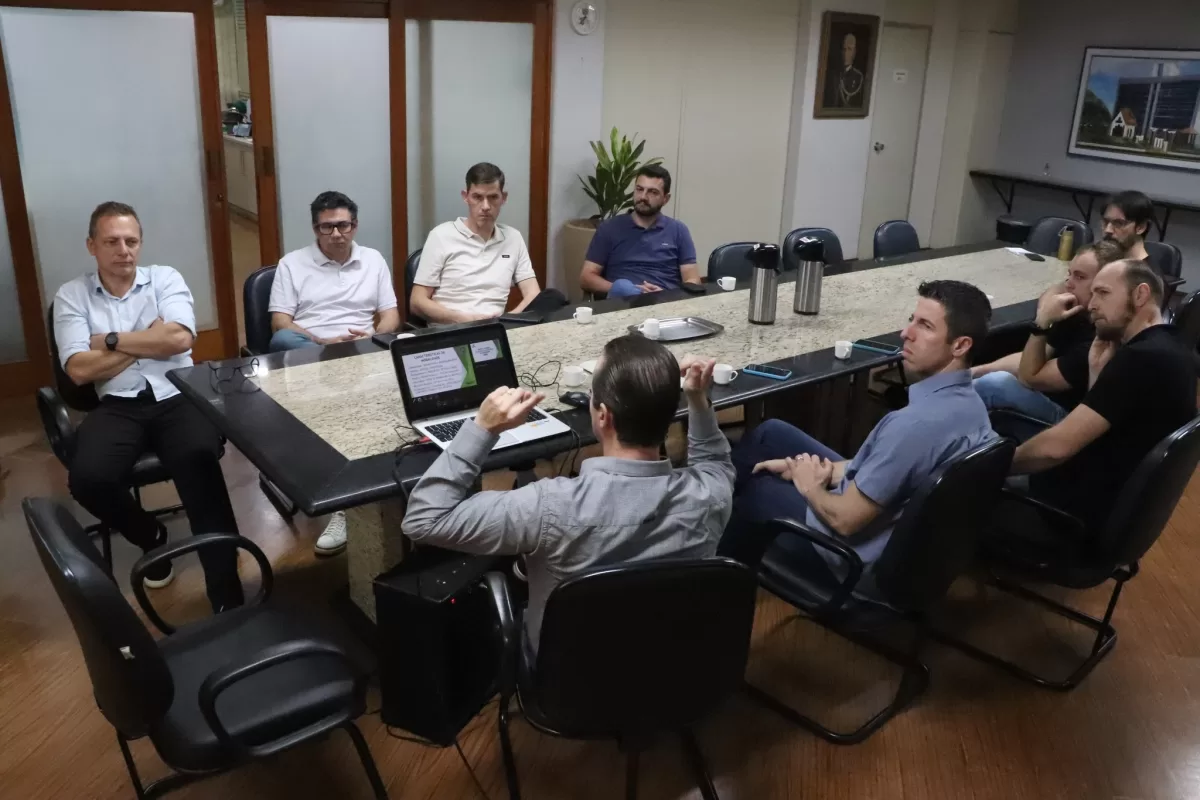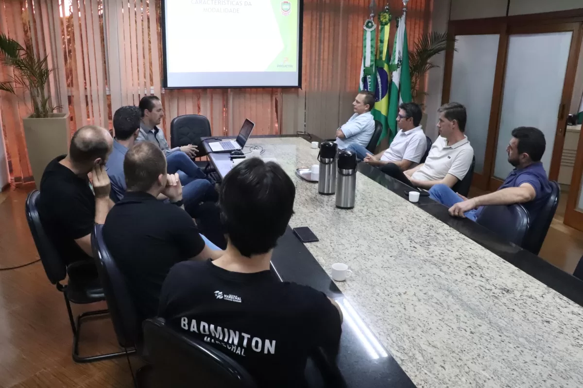 A reunião aconteceu na prefeitura rondonense e contou com a presença de representantes da Associação Rondonense de Badminton (ARBAD), da Projetta – Engenharia e Arquitetura, além do prefeito Adriano Backes, do vice-prefeito Vanderlei Sauer, do secretário de Desenvolvimento Econômico, Claudio Kohler (Claudinho), e do secretário de Planejamento, Anderson Bento Maria.