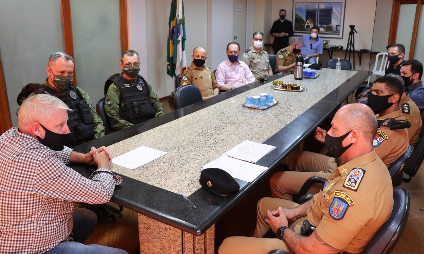 Um importante encontro foi realizado nesta quarta-feira (14), na sala de reuniões do gabinete, na Prefeitura de Marechal Cândido Rondon, que reuniu diversas autoridades policiais, entre elas o comandante-geral da Polícia Militar do Paraná (PMPR), coronel Hudson Leôncio Teixeira, comandante do 5º Comando Regional da Polícia Militar de Cascavel, coronel Sergio Almir Teixeira, comandante do 19º Batalhão da PM de Toledo, coronel José Osmar Novach, além de representantes locais do Batalhão de Polícia de Fronteira, Corpo de Bombeiros, Polícia Civil e Policia Rodoviária Estadual.